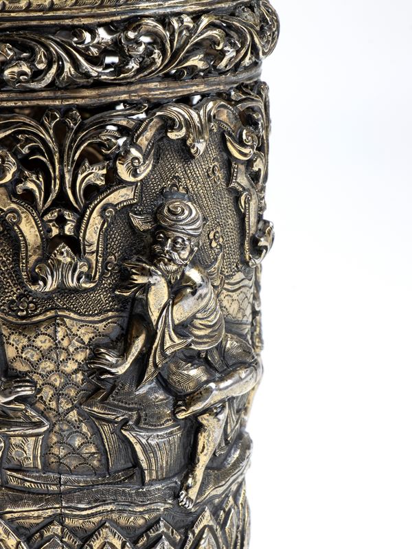 L'esterno con una fine decorazione in accentuato rilievo con figure e arabeschi vegetali, la fascia superiore nei pressi della bocca lavorata 'a giorno'.