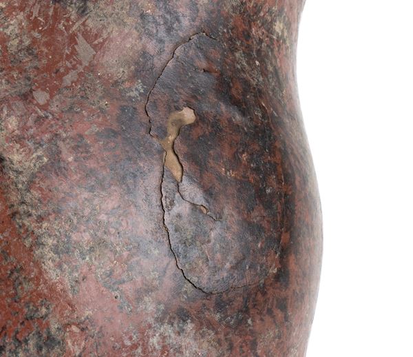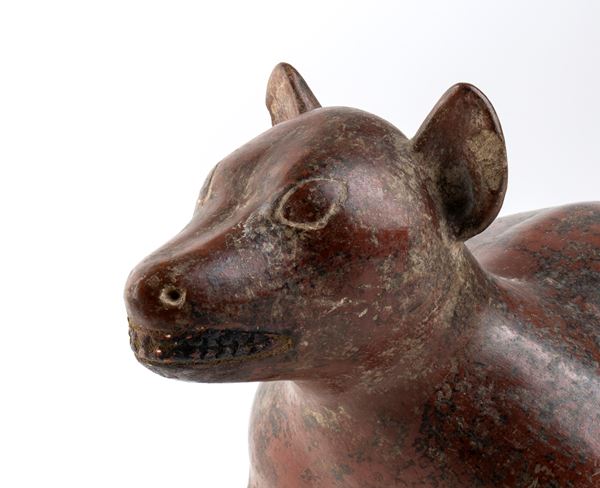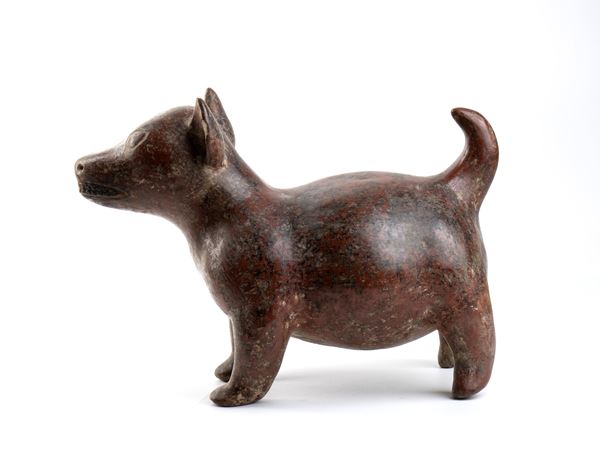 L'animale raffigurato stante con la coda tesa rivolta all'insù, la terracotta di colore rosso scuro con macchie nere.