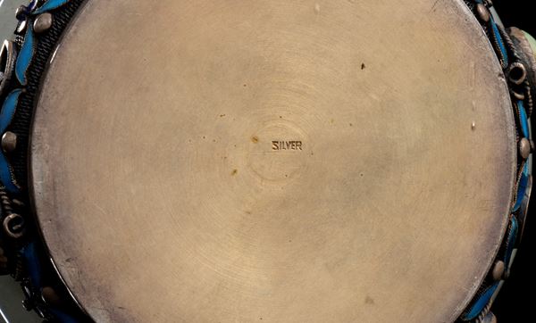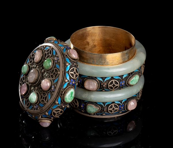 CONTENITORE CILINDRICO CON COPERCHIO IN METALLO SMALTATO, GIADA E PIETRE DURE