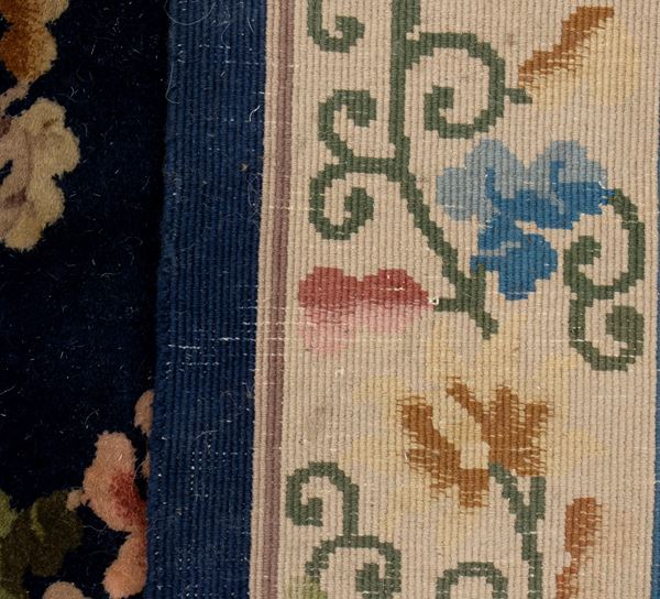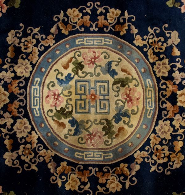 Fondo blu e ocra, al centro un medaglione circolare intorno al quale si dispongono composizioni floreali in policromia.