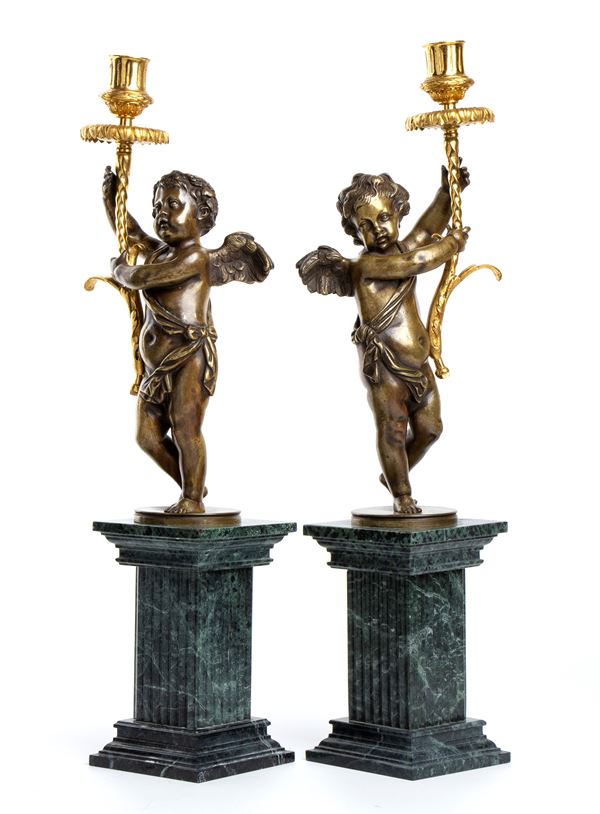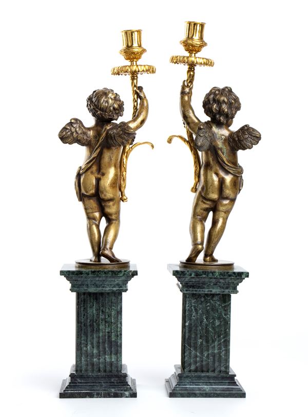 Bella coppia di putti reggicandela posizionati su alte colonne rastremate in marmo verde, probabilmente postume. Modelli simili vennero prodotti in Francia dal XVIII secolo in poi.