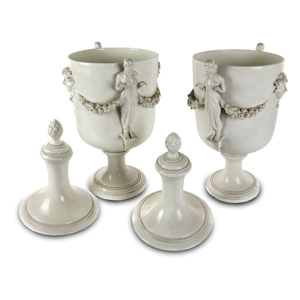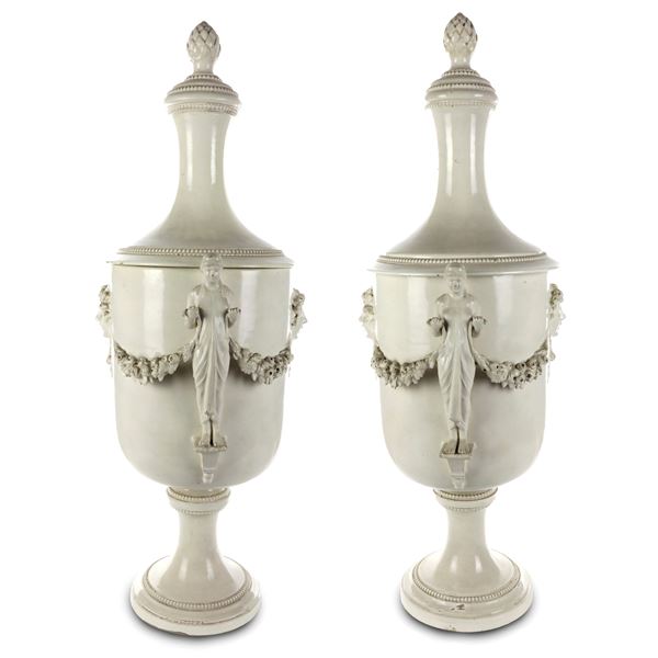 Coppia di vasi in ceramica a smalto bianco,, Manifattura probabilmente napoletana, XIX secolo