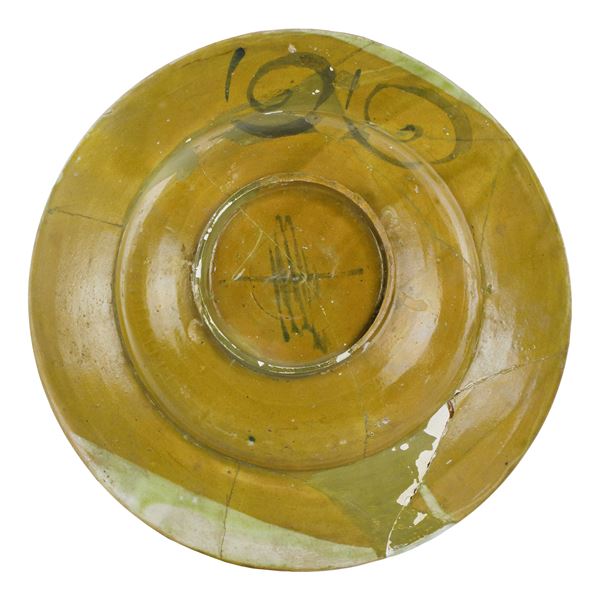 Larga tesa ad orlo rialzato che continua in una corta balza verticale terminante in un ampio fondo. Al retro appoggio ad anello. Decorazione a motivi vegetali sulla tesa, nel fondo entro riserva ad anelli la scritta dedicatoria in posizione centrale compresa tra due fasce a motivi embricati. Decoro al verso nei colori verde, manganese rosso su fondo bianco. Al retro motivi geometrici sotto smalto color ocra.