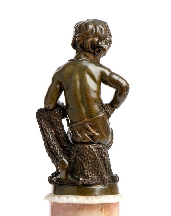 Il bronzo in oggetto rappresenta un putto in veste di pescatore, probabilmente parte di una serie di "mestieri".