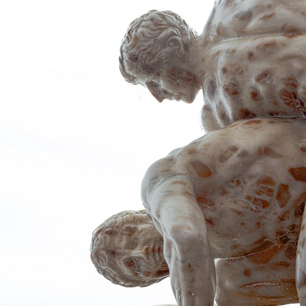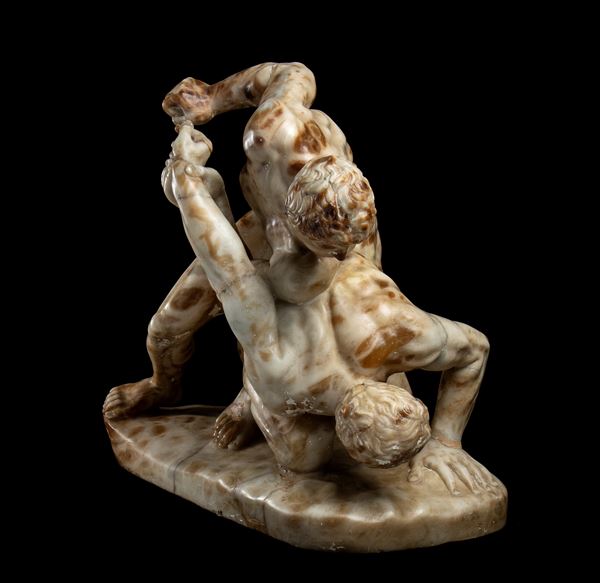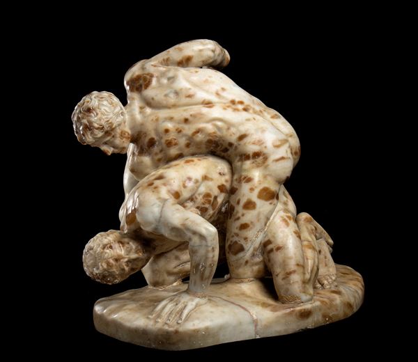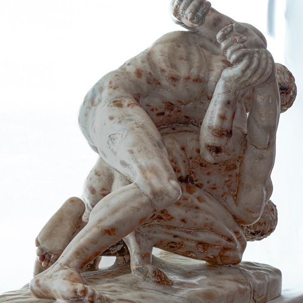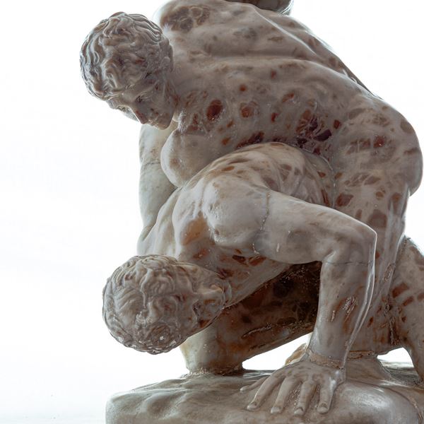 Il gruppo in oggetto è realizzato con una breccia antica maculata dai toni rossastri, probabilmente una rara qualità di alabastro. Visto il soggetto cruento, sembra scelta per imitare gli ematomi dei lottatori.