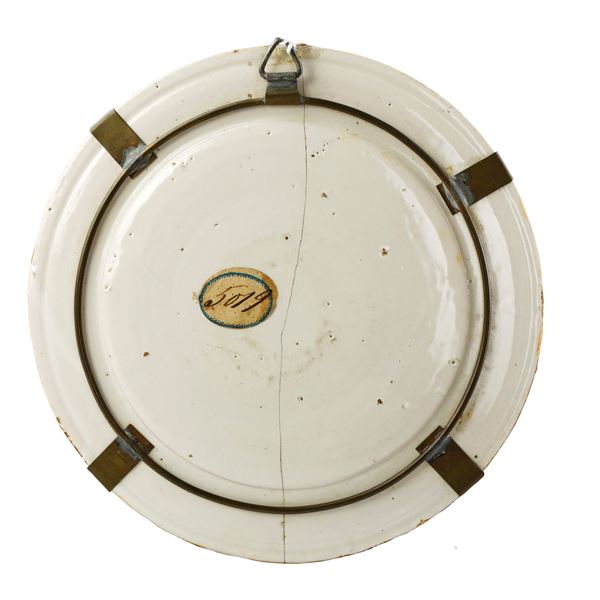 con stretta falda ed ampio fondo, decorato con fiori e putti lungo la tesa e scena di danza nel cavo. Al verso fondo liscio, bottega dei Groue.