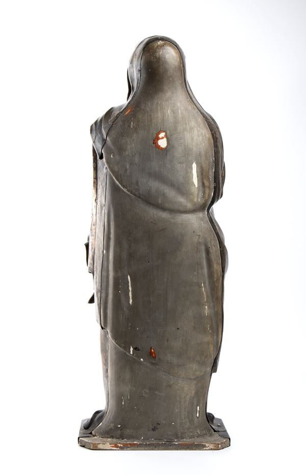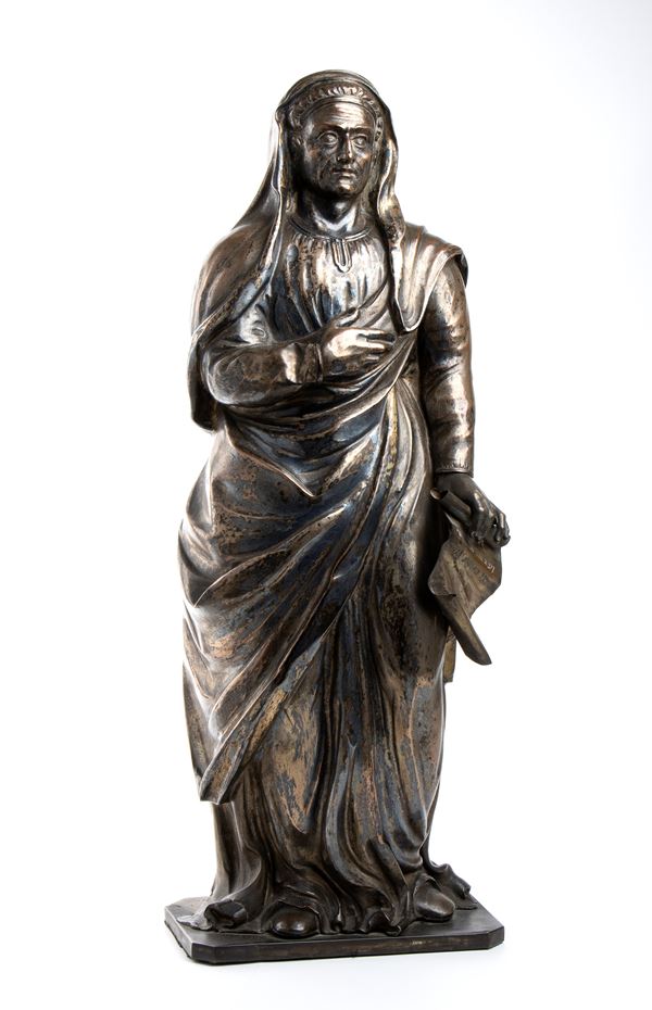 Questa grande scultura presenta una struttura in legno, visibile dal retro, rivestita da una lamina in rame finemente sbalzato e cesellato. Raffigura un soggetto biblico estremamente raro, ovvero la Profetessa Anna, che, rimasta vedova in giovane età, spenderà la sua vita a servire nel tempio. Nel momento in cui Gesù sarà presentato dai genitori al tempio, lei immediatamente lo riconoscerà come il nostro Salvatore ed in tal senso predicherà.