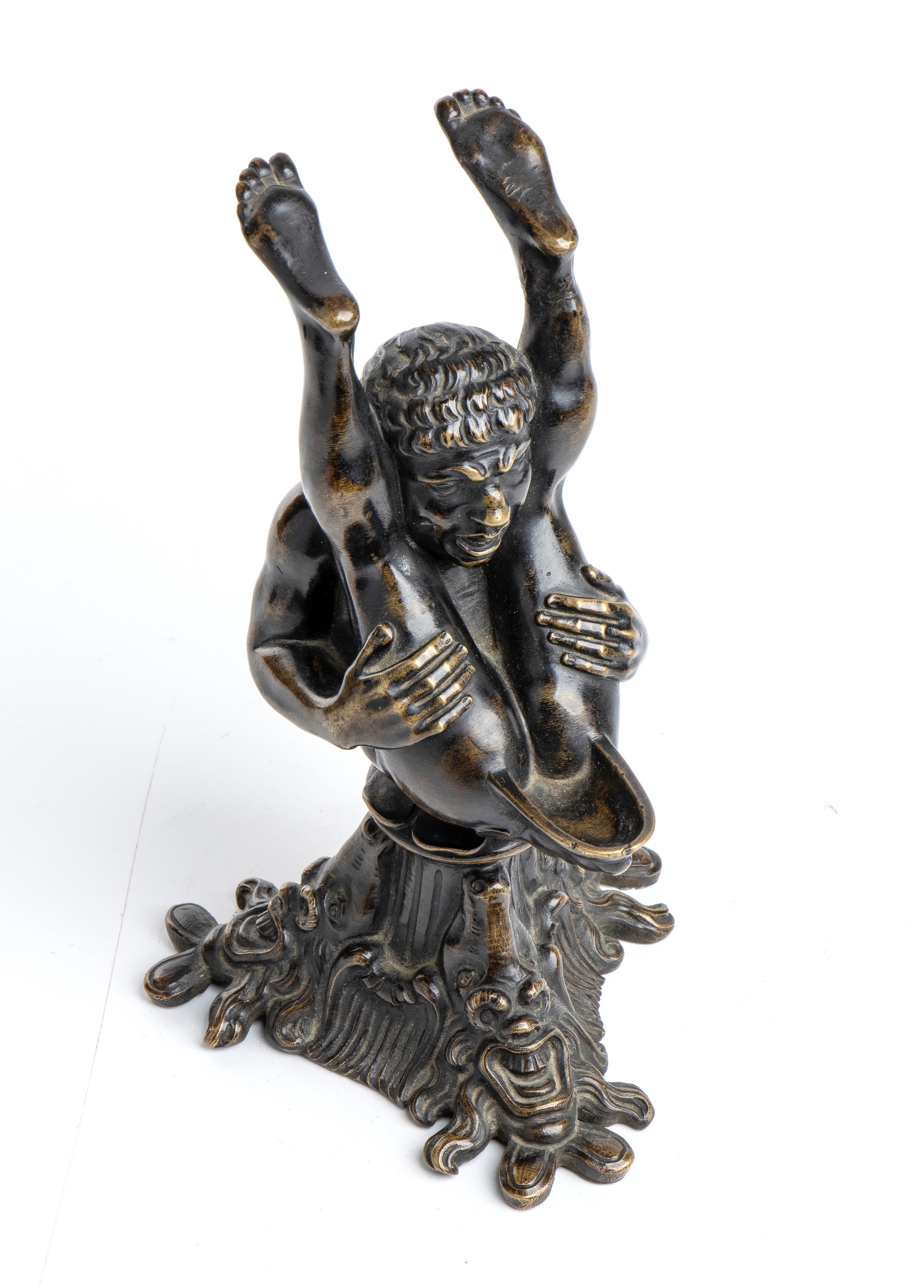 Questo curioso oggetto si ispira ad una famosa lucerna attribuita in antico ad Andrea Briosco detto il Riccio, ma ora riportata all'ambito di Severo da Ravenna.