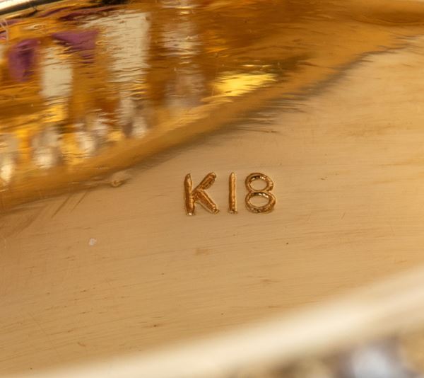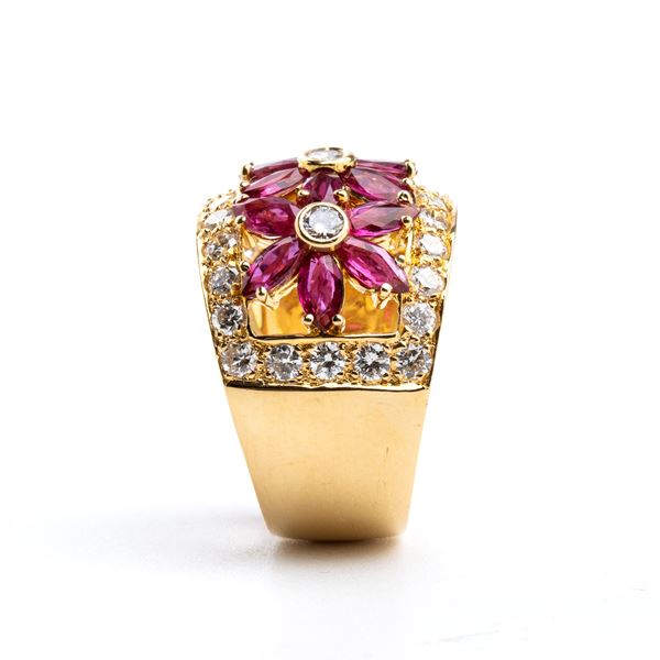 in oro giallo 18k, con tre motivi centrali a fiore in rubini tra profili di diamanti.