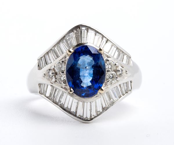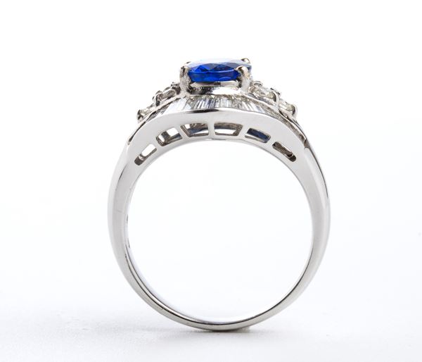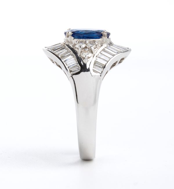 oro bianco 18k, Incastonato con zaffiro ovale contornato da nastri in diamanti baguette ad affiancato da brillanti.