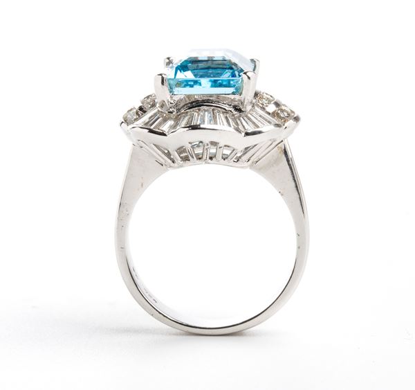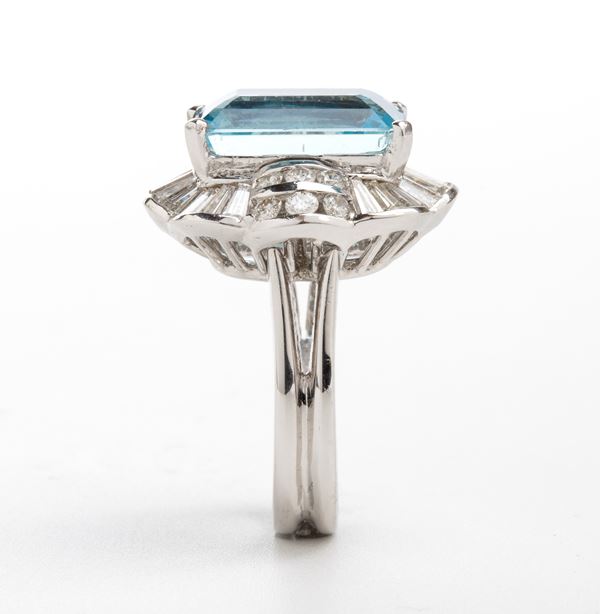 montatura a ballerina in oro bianco 18k con acquamarina centrale e contorno di diamanti.
