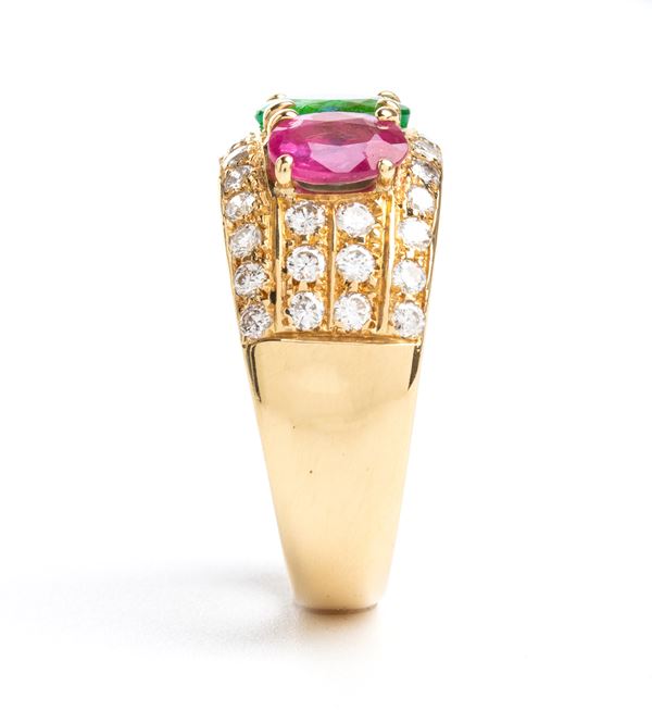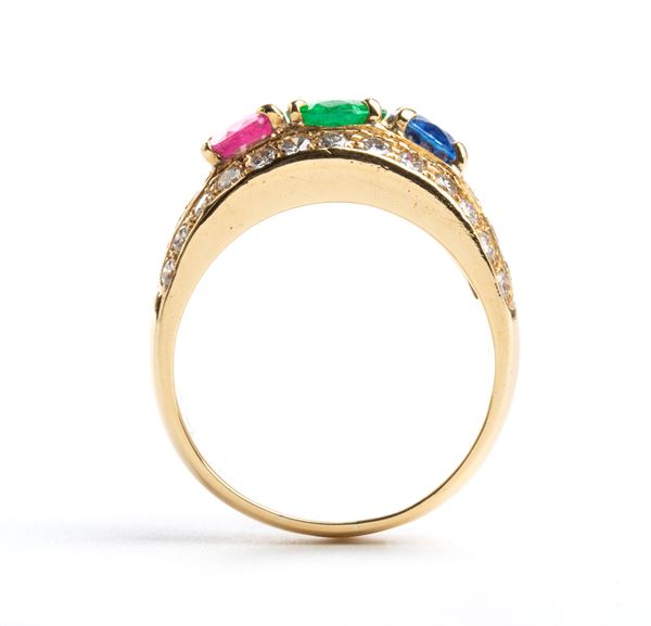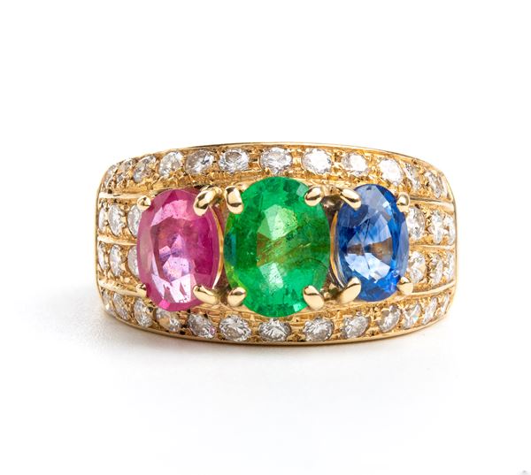 modellato come una fascia, incastonato con linea centrale composta da un rubino composito, uno smeraldo ed uno zaffiro contornati da diamanti.