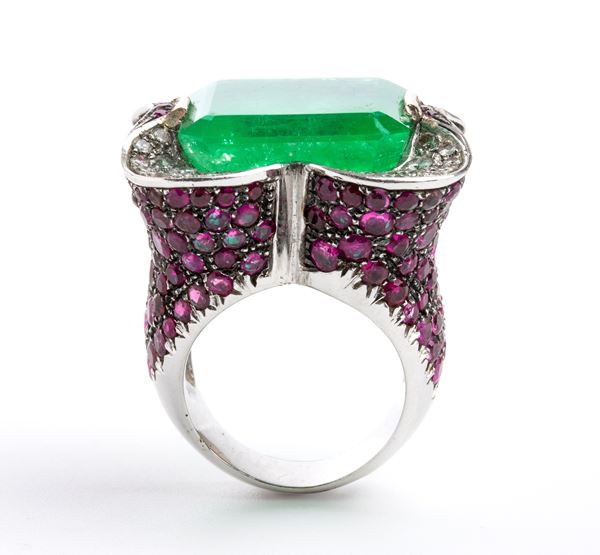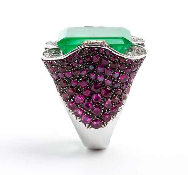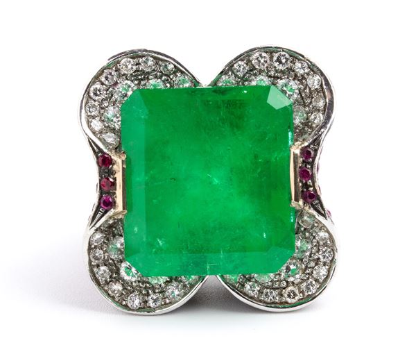 a forma di fiore, impreziosito da uno smeraldo di forma ottagonale, taglio a gradini di circa 30.15 ct. Origine: Brasile