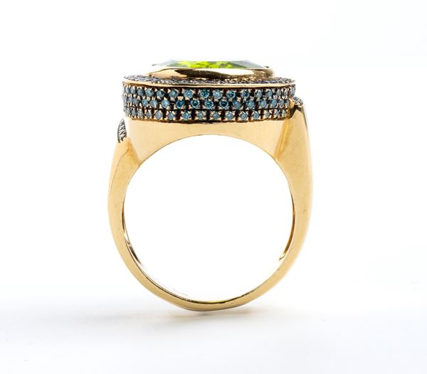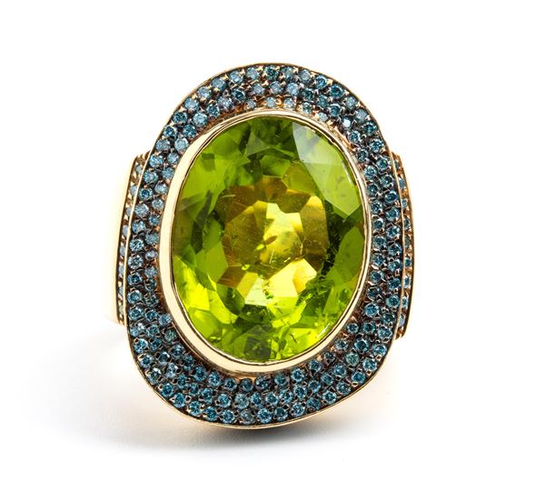 modellato come una fascia in oro giallo 18k, incastonato con grande peridoto ovale contornato da pavè di diamanti blu.