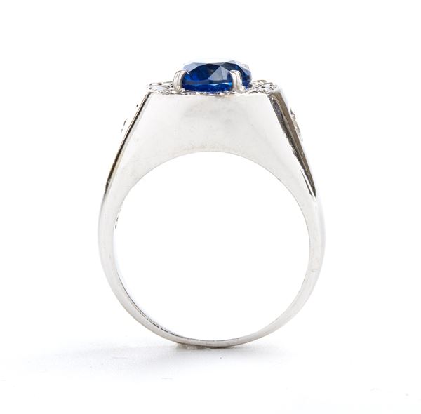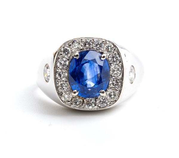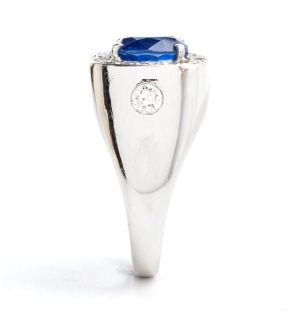 modellato come una fascia, incastonato con zaffiro ovale tra cornice di diamanti.