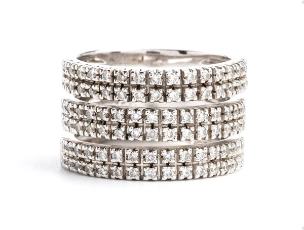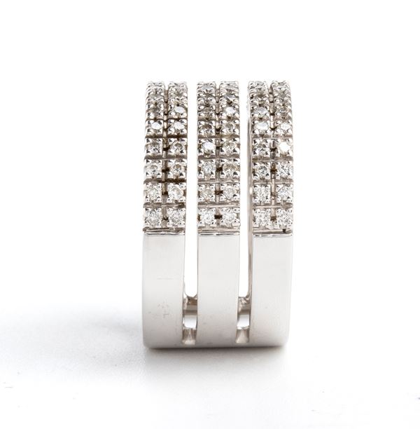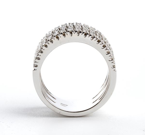 modellato come una fascia in oro bianco 18k, incastonato con file di diamanti.