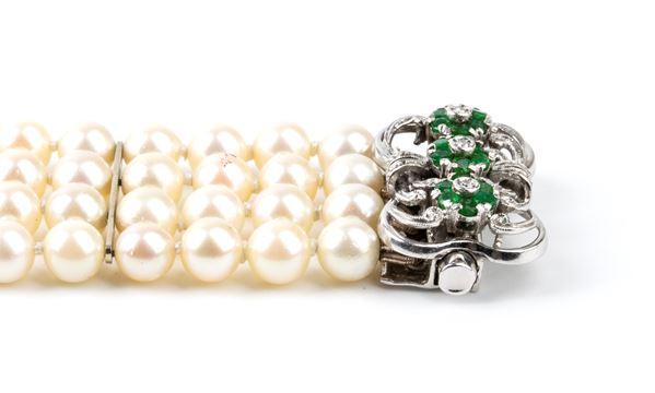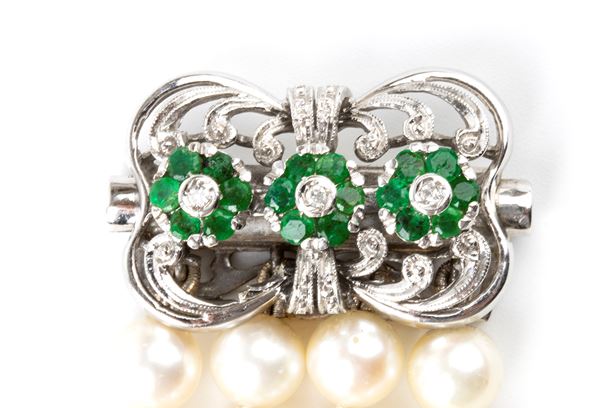 a quattro fili di perle coltivate d'acqua salata con chiusura in oro bianco 18k con tre motivi a fiore in smeraldi e diamanti.