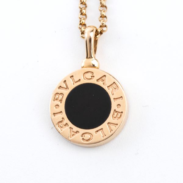 in oro giallo 18k, con catena a maglia rolò a cui è sospeso un pendente incastonato con onice. Firmato BVLGARI.