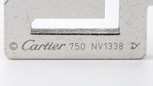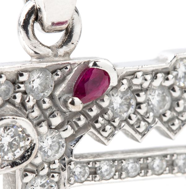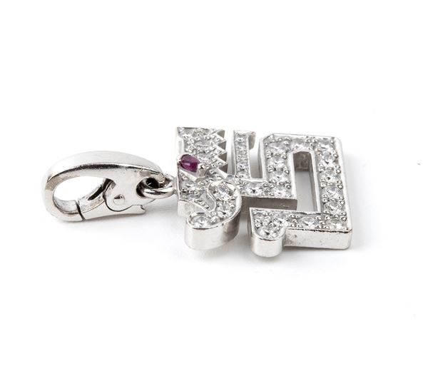 in oro bianco 18k, pendente scaramantico raffigurante un drago cinese con il corpo in diamanti, occhio in piccolo rubino. Firmato CARTIER.