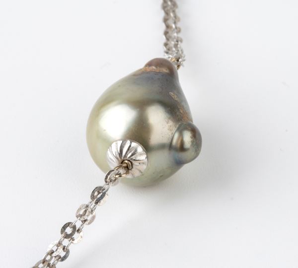 con catena a maglia forzatina in oro bianco 18k, interrotta da perle Tahiti, al centro un piccolo motivo a fiore in diamanti per circa 0.13 ct, G-H, VS.
