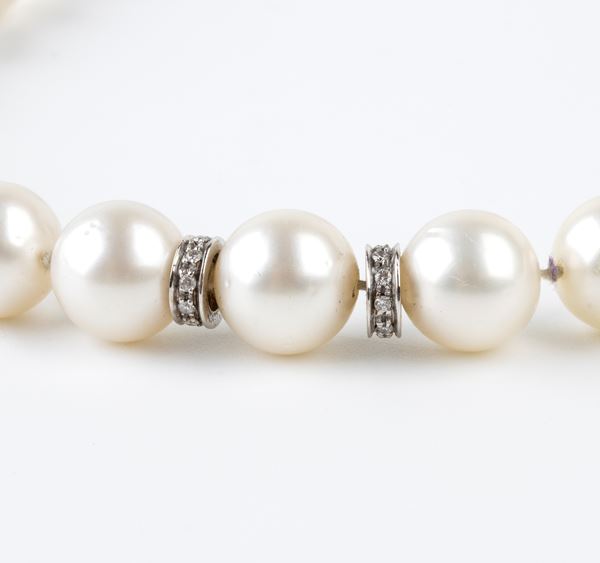 ad un filo di perle Australiane disposte in lieve gradazione, interrotte da distanziali ad anello in oro bianco 18k, decorate con diamanti.
