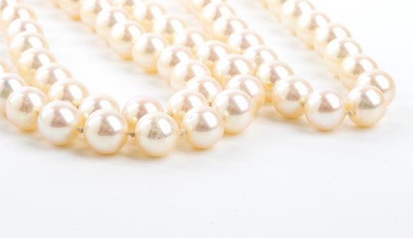 ad un filo di perle coltivate d'acqua salata con fermezza in oro bianco a motivo floreale.