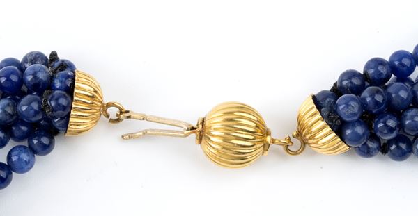 fermezza a scomparsa e distanziali in oro giallo 18k, 6 fili di sfere di sodalite, diametro 4 - 4.5 mm.