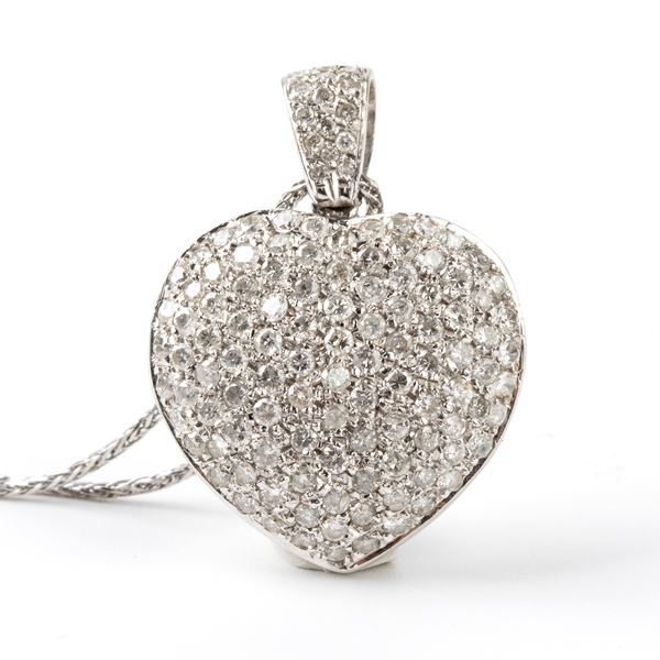 Il pendente è impreziosito da un pavé di diamanti rotondi, taglio brillante, per circa 2.15 ct, G-H, SI.