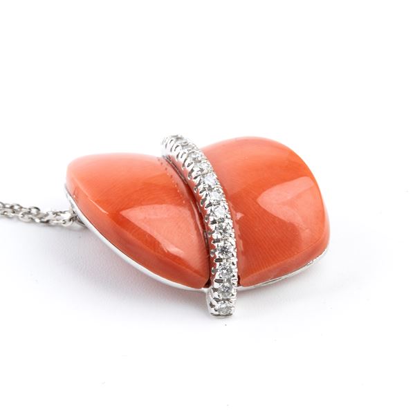 in oro bianco 18k, con catena a maglia forzatina a cui è sospeso un pendente con elemento in corallo Cerasuolo (Corallium Elatius) e nastro in diamanti.