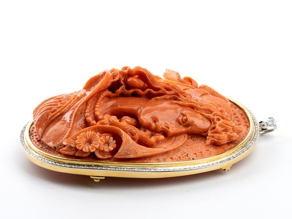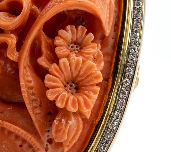 con cammeo scolpito in corallo Cerasuolo (Corallium Eliatus) raffigurante il profilo di una nobildonna adornata di gioielli e fiori, inserita in una cornice di diamanti di forma rotonda, taglio brillante per circa 1.50 ct, H-I, VS.