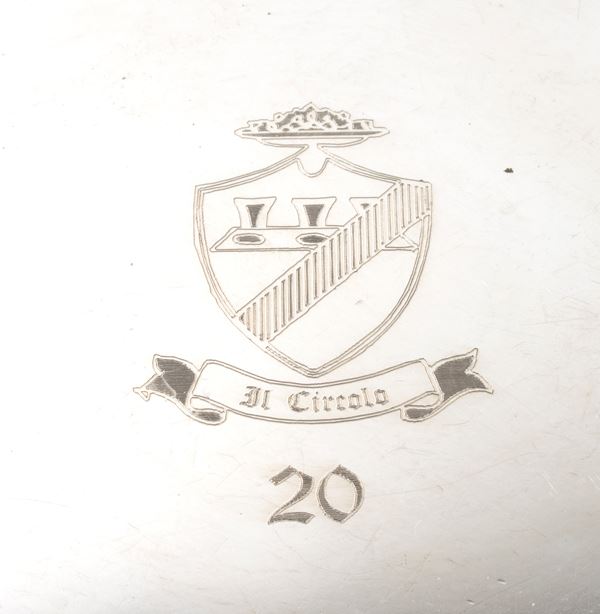 4) un piattino con data incisa al centro, in argento al titolo minimo di 800/1000, punzonato "800". Dimensioni: 15 x 15 cm.