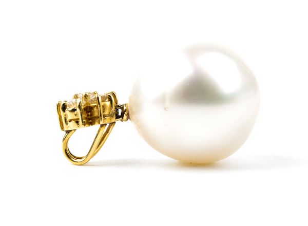 con perla Australiana di diametro 15 - 15,5 mm, sormontata da motivo a fiore in da diamanti taglio brillante per totali 0.42 ct, H-I, VS-SI.