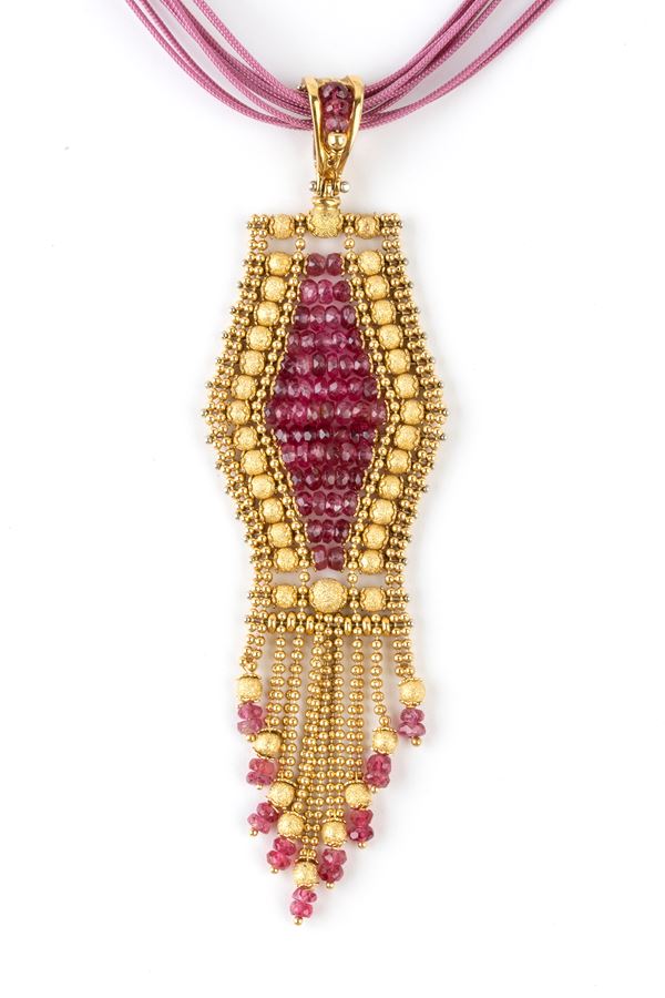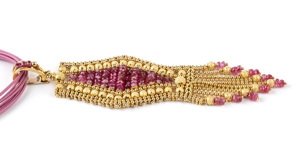 a forma di nastro, con rondelle di spinelli rossi nell'interno, sfere in oro giallo puntinato lungo il perimetro esterno e frangia terrminale. Firmato SUN DAY.