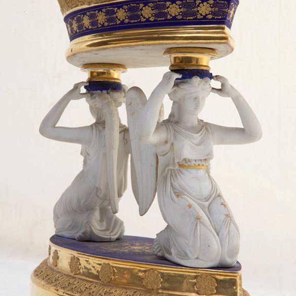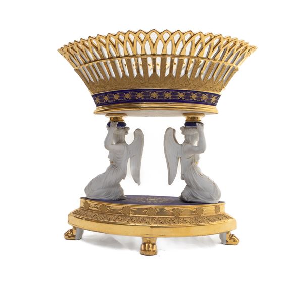 a forma di canestro traforato che poggia su coppia di angeli in bisquit . Angeli poggianti su base ovale a gradoni con quattro piedi  di appoggio ferini.  Decoro in oro zecchino e blu di cobalto alla base e nel canestro, angeli in monocromo . Finiture con fasce ad elementi floreali a rilievo.