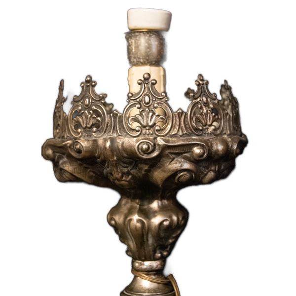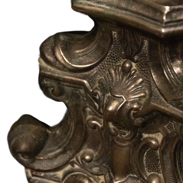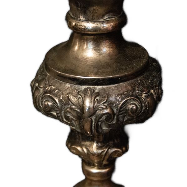 Coppia di candelieri in metallo argentato, seconda metà XIX secolo