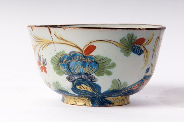 tazza a campana con piatto en suite, decoro "a garofano" 5,5 x 7,5 cm  e 12,4 x 3 cm  ; tazza a litron con presa  ad orecchio e piatto en suite, decorazioni in monocromia a fiori verdi su fondo bianco 6 x 6 cm e 12 x 2,5 cm .Manifattura Ferniani, seconda metà XVIII secolo