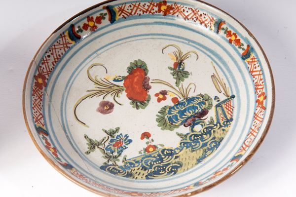 Lotto di due tazze da caffè con piatto in ceramica policroma :