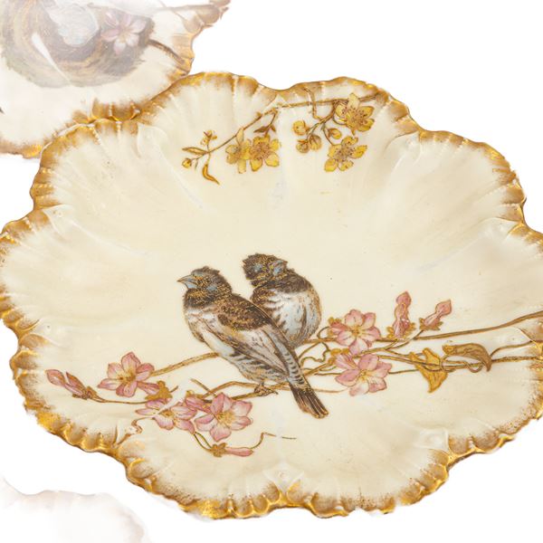 Lotto di otto piatti in porcellana policroma con decoro floreale ed animale, primo quarto del XX secolo