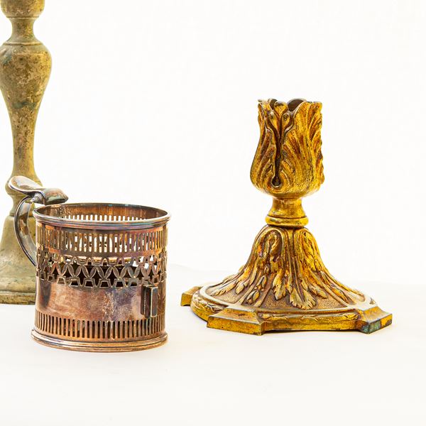 Lotto di quattro candelieri in metallo parte argentato a forme e dimensioni differenti, XX secolo
