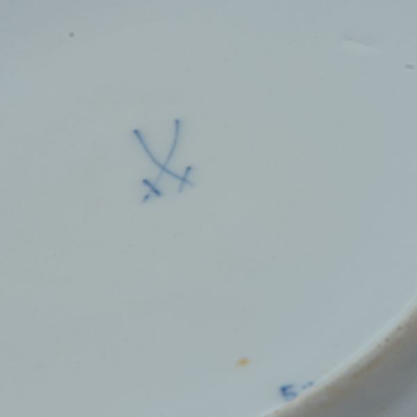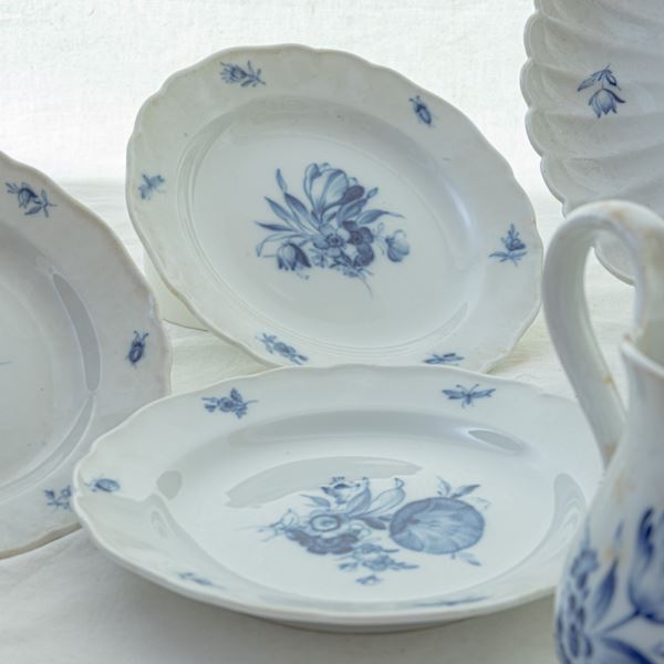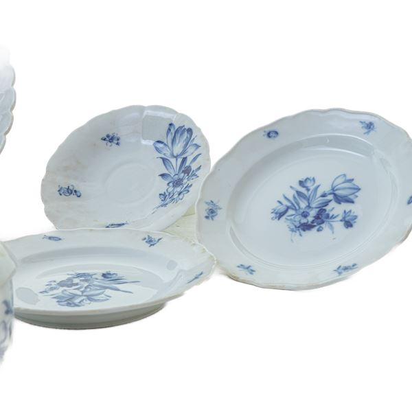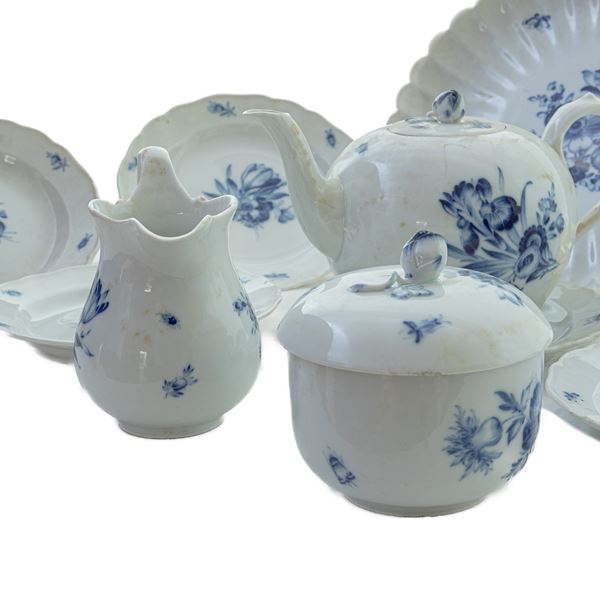 bianca con decoro a fiori ed insetti composta da: 1 teiera , 1 lattiera , 6 piatti da dessert , 6 piatti da tazza , 1 tazza con coperchio , 1 vassoio dal bordo mistilineo e corpo costolato. Manifattura Meissen