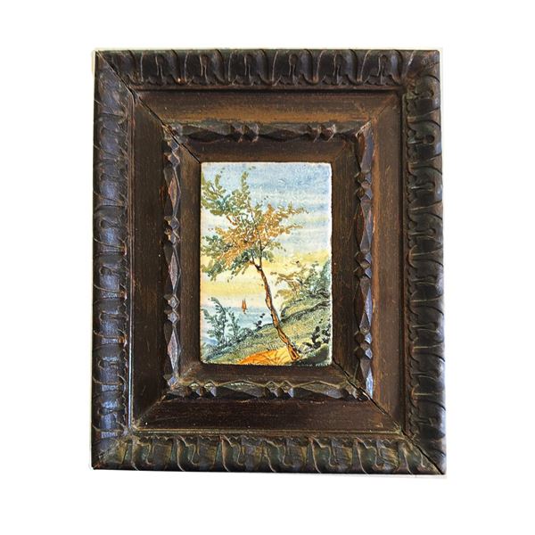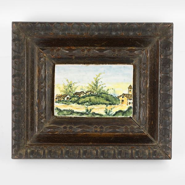 due placche in cornice in legno intagliato ed ebanizzato con scorci di paesaggio. Terza placca in ceramica policroma con scorcio di paesaggio in cornice dorata, firmata a fronte in basso a sinistra A. Bontempo. Castelli d 'Abruzzo