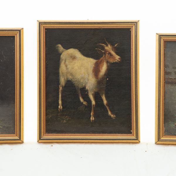 Lotto di tre dipinti :capra, asino e galline, inizio XX secolo