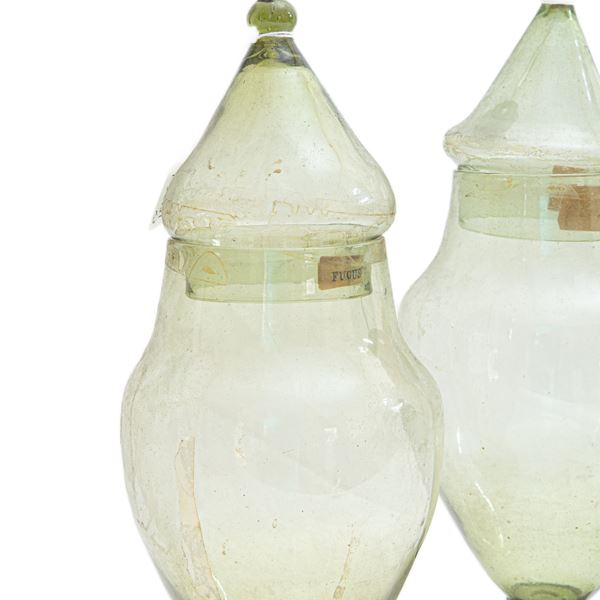 Lotto di tre vasi da farmacia in vetro soffiato verde, XIX secolo