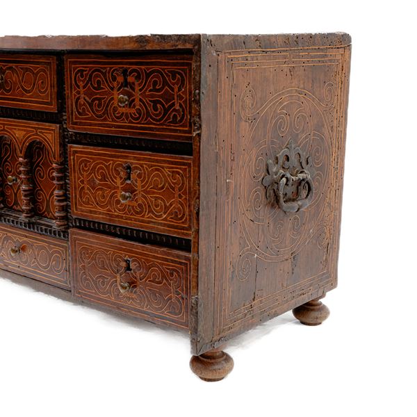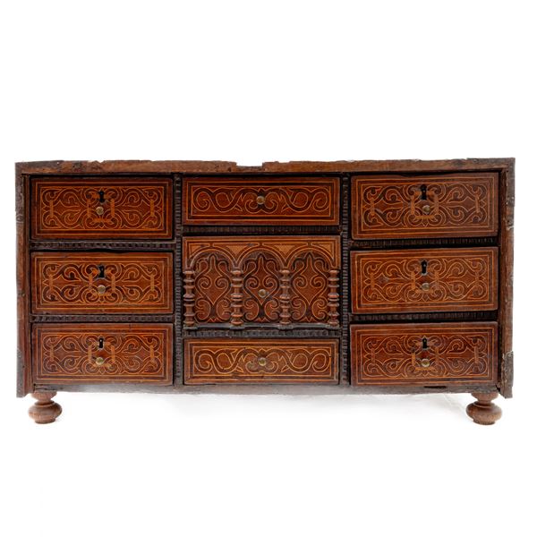 Monetiere in noce a nove cassetti, arte portoghese XVII secolo