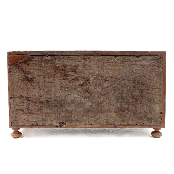 di forma rettangolare con quattro piedi d'appoggio a cipolla, intarsi in legno di frutto sui cassetti e sui fianchi. Mancante dello sportello di chiusura.