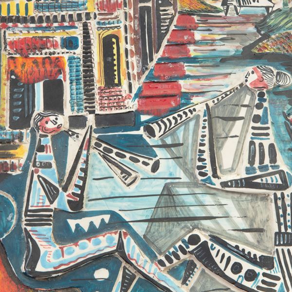 con elementi a rilievo. Decoro a paesaggio urbano con personaggi e suonatori. Firmato al fronte e al retro
