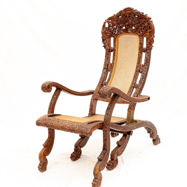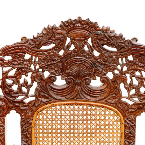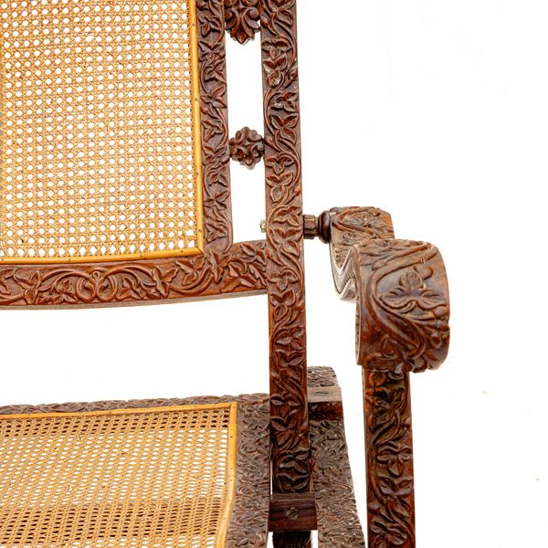 Poltrona in legno scolpito a motivi floreali, arte indo/portoghese XIX secolo