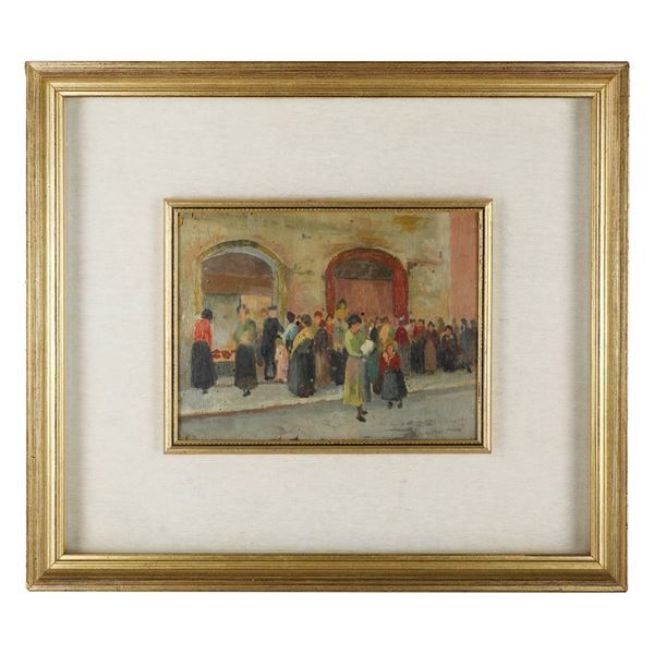 Popolane al mercato, coppia dipinti ad olio su tavola, inizi XX secolo
