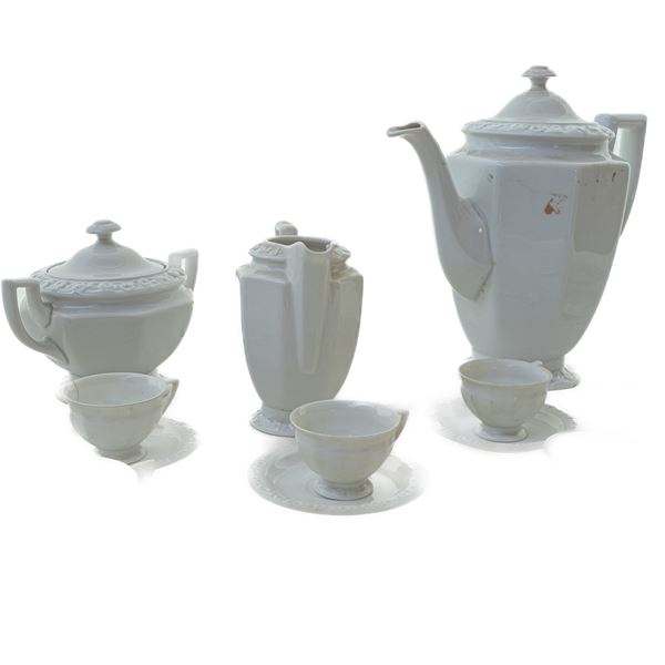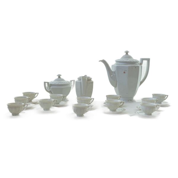 con orli a rilievo a roselline, corpo a costoloni rettangolari verticali rastremati verso il basso. Composto da: caffettiera , lattiera , zuccheriera e 12 tazzine con piatto. Pezzi 27