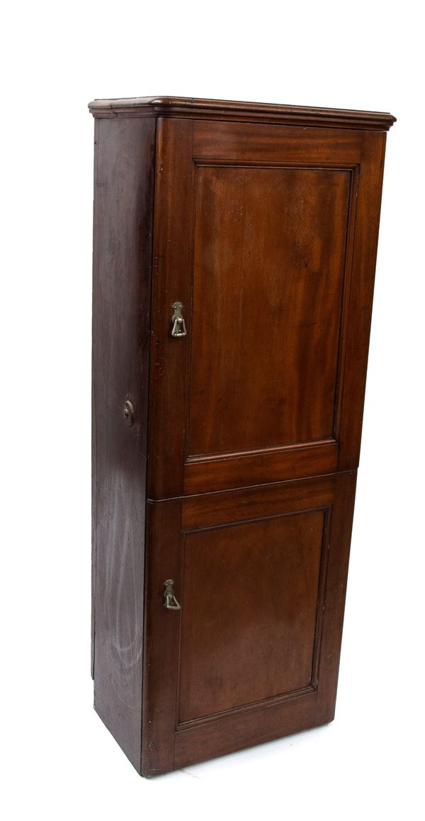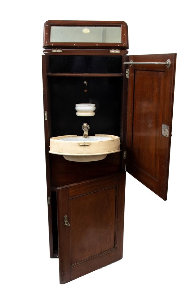 Armadietto da demolizione navale di transatlantico; In legno; con doppia anta; lavello in lamiera, portasapone e serbatoio per l'acqua; munito di specchio e portasalviette